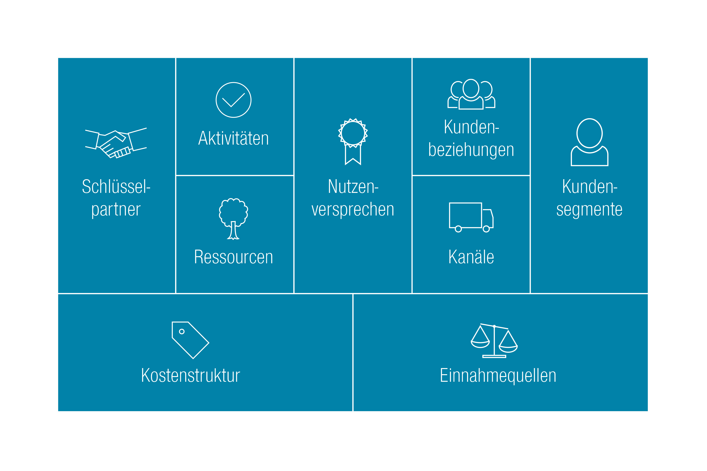 Caption 1: Besides improving internal processes, companies should focus on developing business models. Various aids, such as the Business Model Canvas, can be used to describe the key components and correlations in a company.