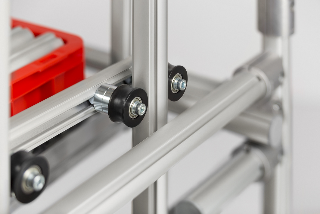 LCA solutions can be implemented at around 10 to 20 percent the cost of conventional automation processes. Users benefit from optimised manual activities and the added flexibility in designing assembly sequences. Additional advantages include simplified and faster production processes. However, the demand for new Karakuri components is increasing all the time, as lean production requirements and tasks in industry become ever more complex. item has therefore extended its portfolio and is offering new, carefully coordinated, high-quality components that satisfy these requirements. For example, synthetic fibre and steel cables and Cable Pulley Wheel D42/D6-12 can be used to create more compact and efficient assembly work bench designs and factory equipment for material flow applications. The high-quality, ball-bearing pulley offers a simple and dependable means of guiding the cable. Thanks to additional LCA components such as Ring Bolt D10 M6x45, cables can be easily secured in a Multiblock or, with the addition of a T-Slot Nut, directly in a groove, so that counterweights or carriages can be guided along profile frames.