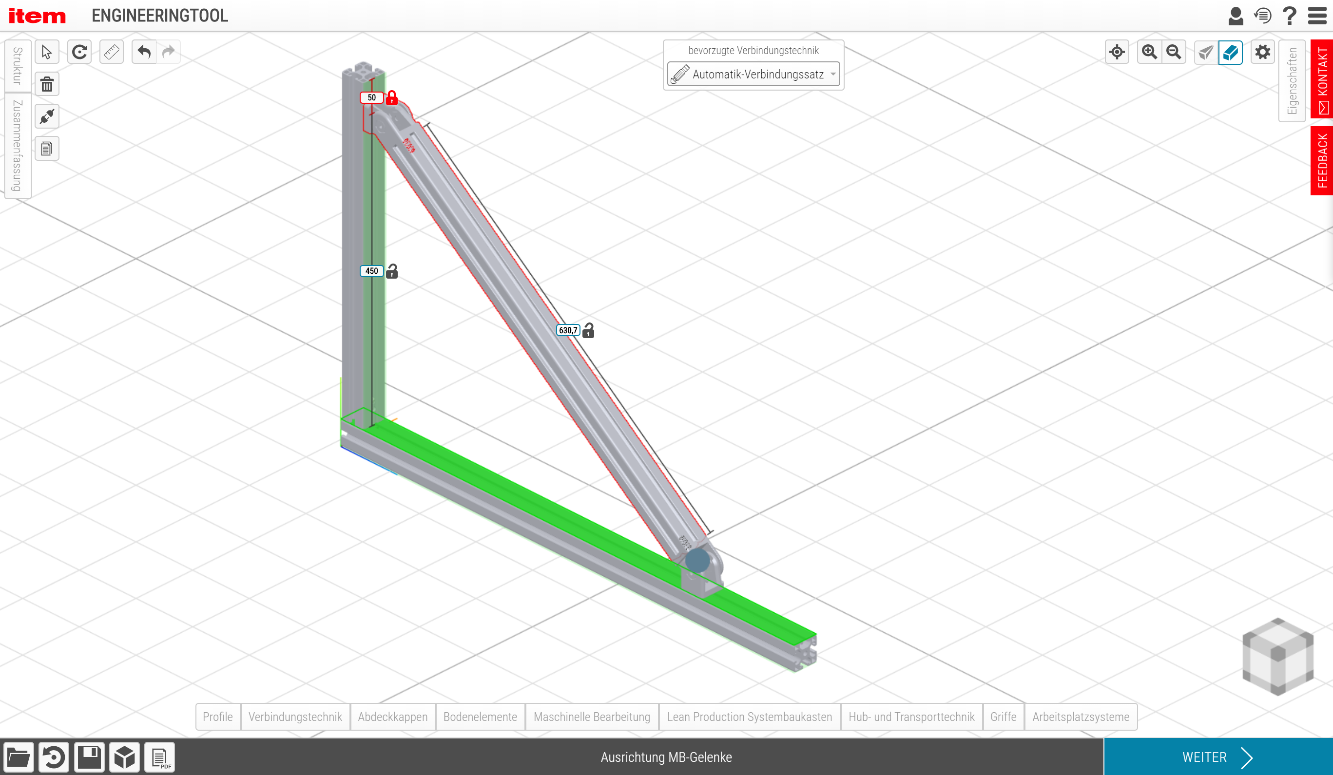 If a construction is being fitted with Hinges, Ball Joint Fasteners or roller conveyors, the item Engineeringtool independently sets the appropriate angles. When working in a CAD system, users have to define the angle themselves. When using the item Engineeringtool, on the other hand, they simply add the relevant profiles to a start point on their design and then drag them via an operating element to their end point. The program automatically indicates the correct angle and the necessary profile length.